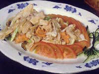 净海蚌肉400克,熟冬笋75克,水发香菇10克,西红柿2个。