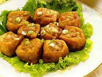 3、将油加热,放入镶绞肉的油豆腐及酱油、糖、胡椒粉、水,盖上锅盖,用小火煮透到汁干时,淋上香油即可。