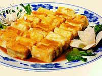 3、旺火热油至五成熟,将豆腐坯沾匀蛋泡糊,逐个炸至变色捞出,油温升至七成热时,重炸至金黄色捞出沥油,肉清汤中加入豆腐、精盐、白糖以小火烧开加醋勾芡起锅即可.