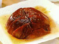 2、将火腿肉切块,用水浸泡,加料酒、冰糖,蒸1小时,八成熟,滗去汤水,再加入料酒、冰糖,用水浸没,续蒸1小时取出,连续三次,将火腿扣在高脚汤盘里,围上莲子,缀上樱桃、青梅;