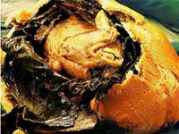 3、酒坛泥碾成粉,加清水拌和,将泥裹在鸡上约五分厚,再用包装纸包裹;
